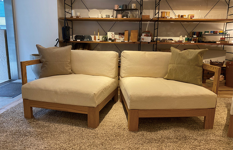 同じデザインのコーナーソファが二つ並んで配置されることで