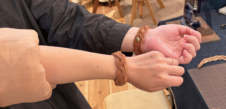 ブレスレットの編み方を教わるお二人(許可をいただき撮影しました)